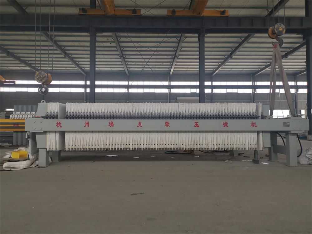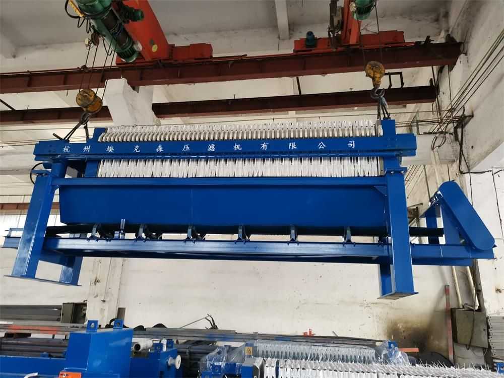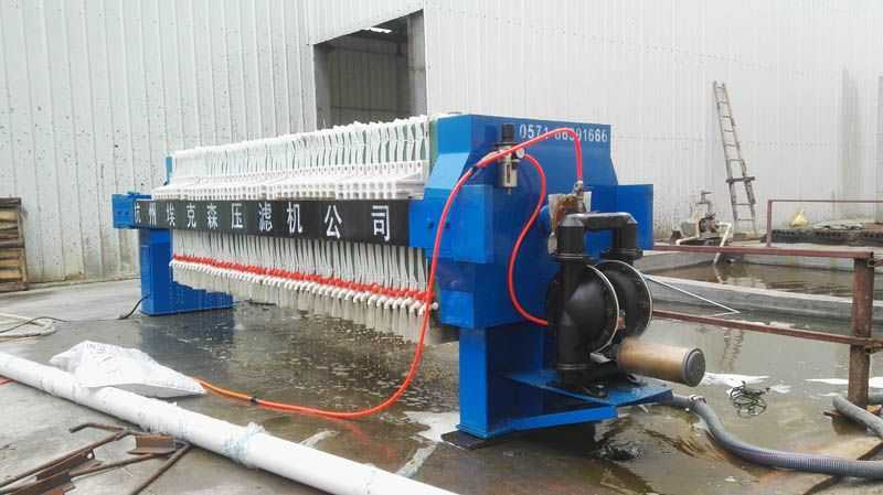 隔膜壓榨壓濾機是由隔膜板和廂式濾板排列組成濾室,在輸料泵的壓力作用下將料漿輸入濾室,通過過濾介質(濾布)將料漿中的固體和液體分離,當料漿中的固體形成餅后,再向隔膜通入空氣,對濾室內的固體充分壓榨。