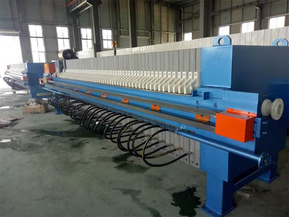 全自動廂式壓濾機與普通廂式壓濾機的不同之處在于多了自動拉板系統,自動接液翻板,自動清洗濾布等系統。使設備操作更加智能化自動化。整機結構設計科學合理,機械強度高、結構穩固、經久耐用并且便于操作和維護。